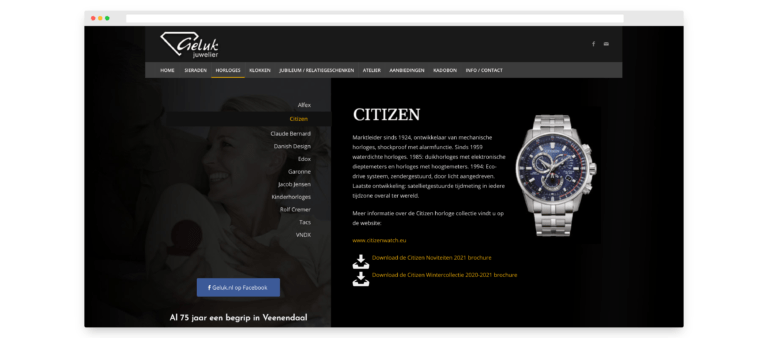 Stijlvolle website met uitgebreid producten overzicht voor juwelier Geluk, gevestigd in Veenendaal.